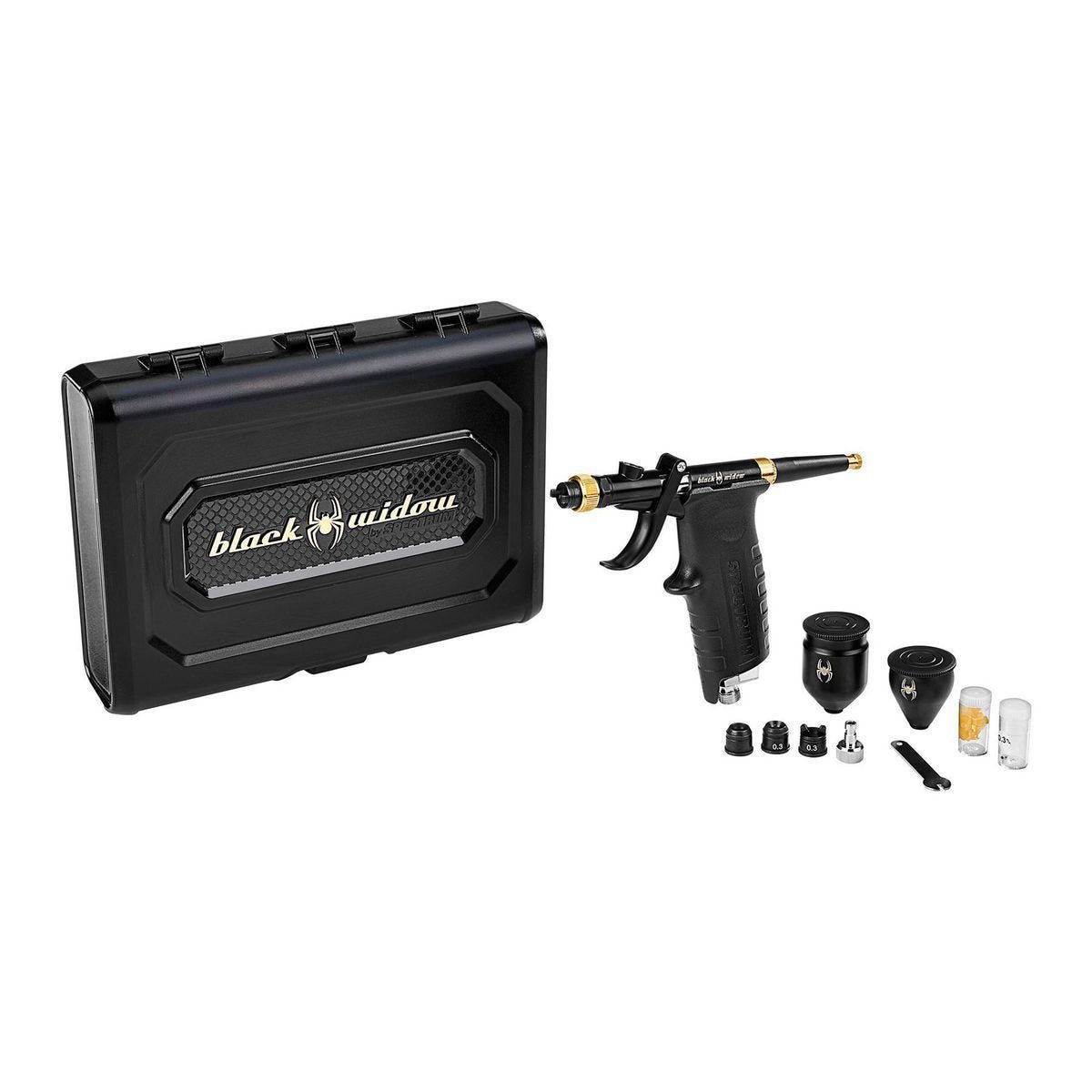 Aerógrafo profesional Black Widow by Spectrum con gatillo, acción dual y boquillas de 0.3 mm y 0.5 mm. Ideal para detalles finos y cobertura amplia. Modelo…