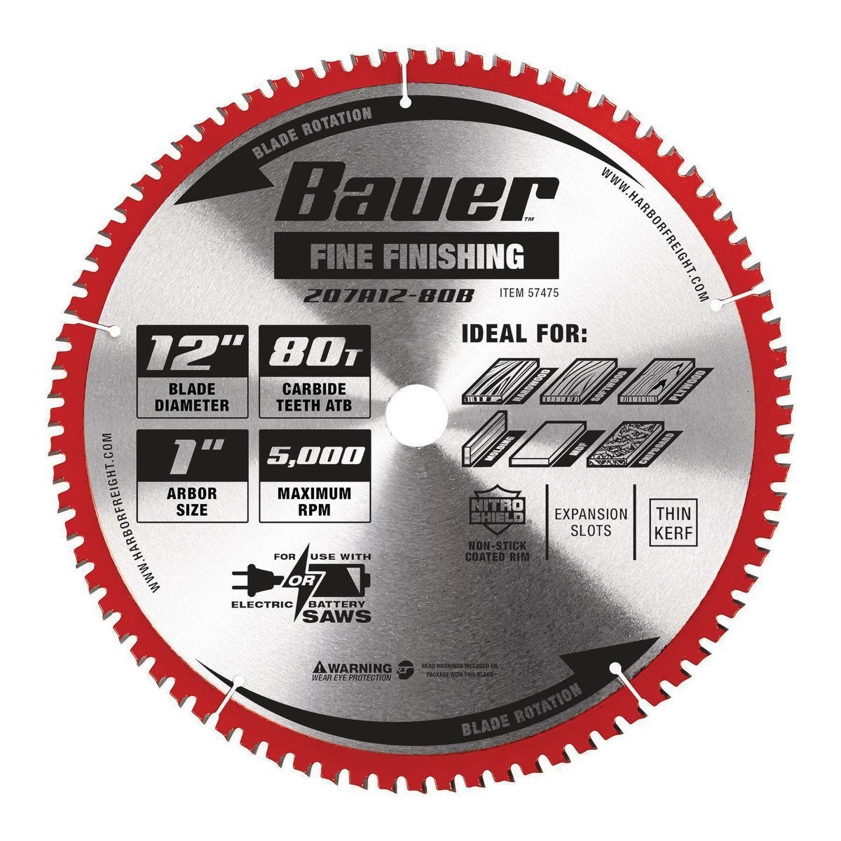 Hoja de sierra circular BAUER de 12 pulgadas y 80 dientes para acabados finos. Corta madera húmeda o tratada con precisión y durabilidad. Modelo 57475.