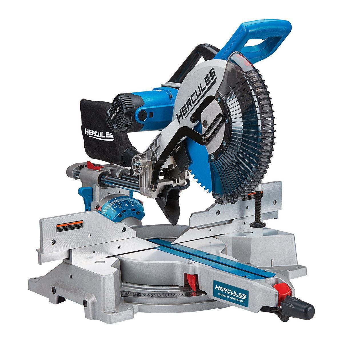 Sierra de inglete profesional HERCULES de 12 pulgadas con doble bisel y guía LED. Motor de 4100 RPM para cortes precisos en madera y molduras. Modelo HE74.