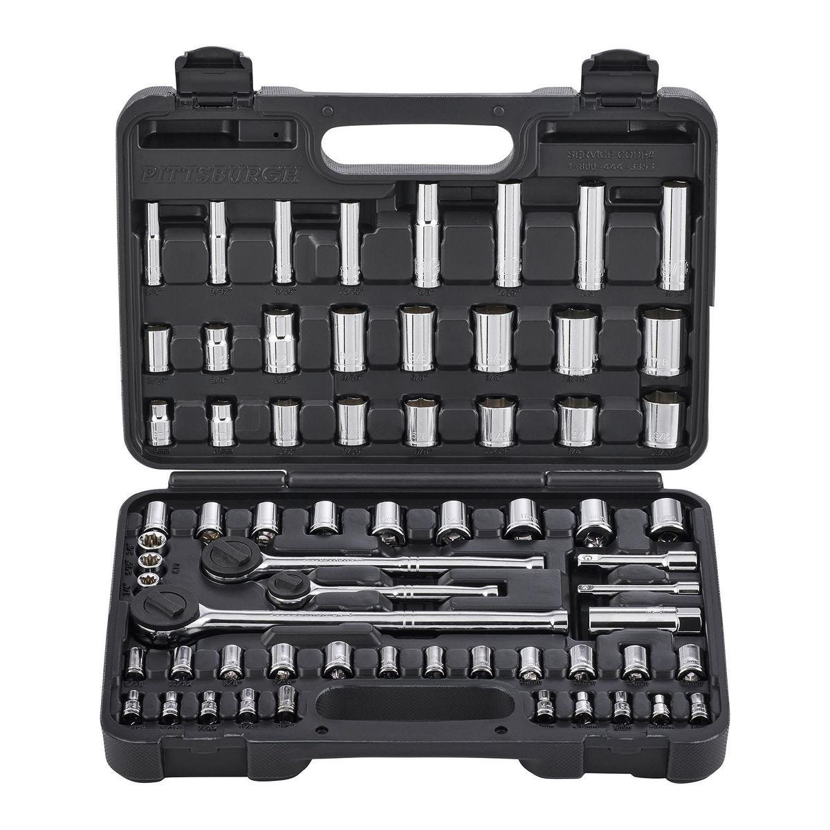 | Contents | (3) Ratchet wrenches: 1/4 in., 3/8 in., and 1/2 in. drive, (26) 1/4 in. Sockets, (27) 3/8 in. Sockets, (6) 1/2 in. Sockets, (2) Extension bars: 1/4 in. and 3/8 in. |