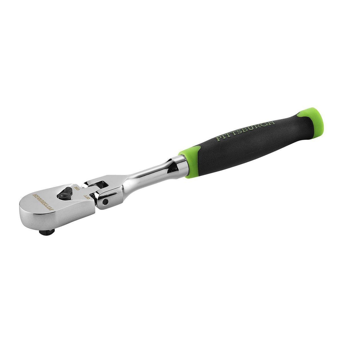 Llave de trinquete Pittsburgh con cabeza flexible de 1/4 pulgada. Ideal para espacios reducidos, con mecanismo de 72 dientes y agarre cómodo. Modelo 70157.