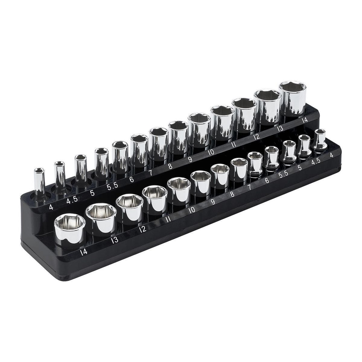 Organiza 26 dados métricos con este porta dados magnético de 2 niveles para drive 1/4. Base magnética potente y recubrimiento protector. Marca U.S. GENERAL.