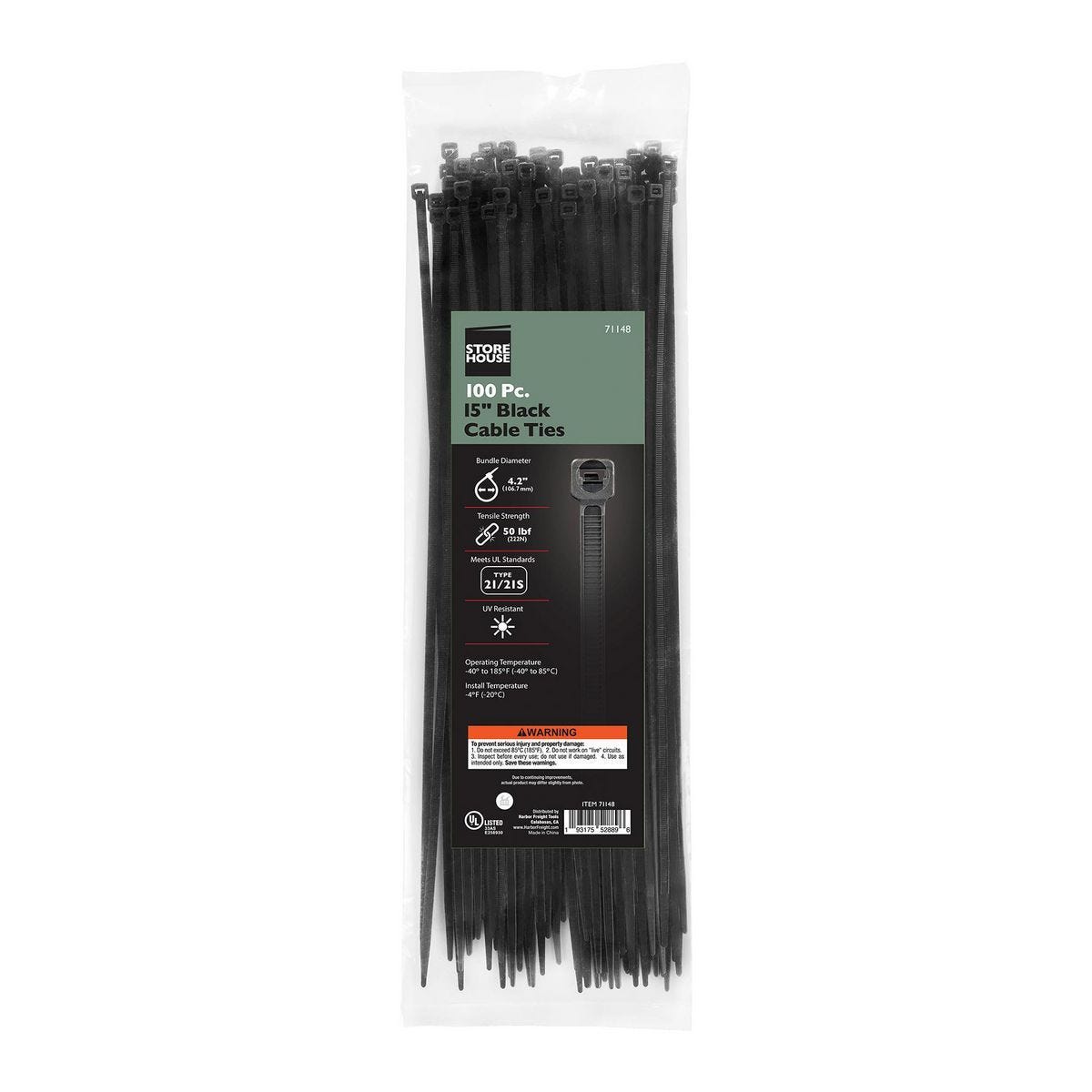 Cable ties negros de 15 pulgadas, paquete de 100. Nylon resistente con certificación UV para interior y exterior. Modelo 71148 de STOREHOUSE.