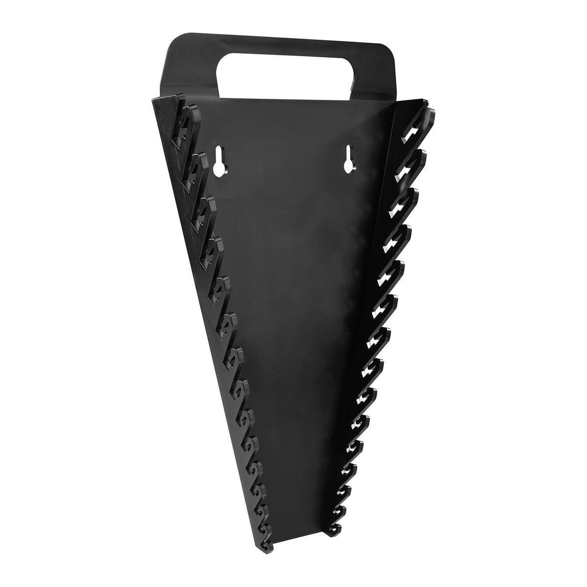 Organizador portátil para llaves U.S. GENERAL, diseñado para mantener ordenadas tus llaves de boca y combinadas. Este práctico accesorio cuenta con 15 ranuras que sujetan de forma segura las llaves durante el transporte, facilitando su extracción cuando las necesitas. Su perfil bajo lo hace ideal para almacenarlo en la mayoría de los cajones de herramientas, ahorrando espacio valioso. Incluye asas integradas para un fácil traslado y un orificio pasante que permite montarlo en la pared. Es compatible con una amplia gama de tamaños, desde llaves métricas de 6 mm hasta 20 mm y llaves pulgadas desde 1/4″ hasta 1-1/8″. Fabricado en plástico resistente de color negro, es la solución perfecta para talleres mecánicos, aficionados al bricolaje o cualquier persona que valore el orden en su espacio de trabajo. Modelo 70874.