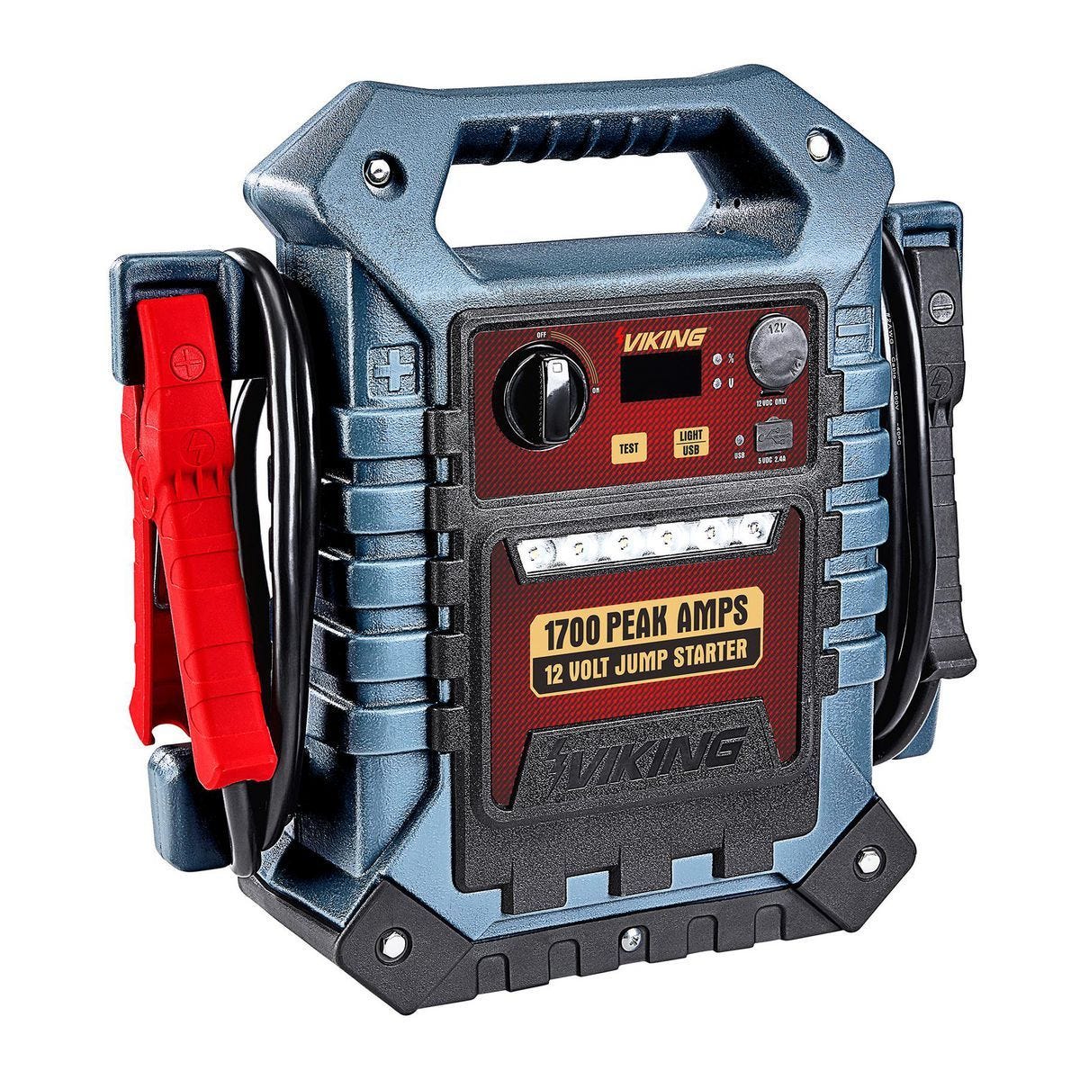 Arrancador portátil VIKING de 1700A pico para motores V8 gasolina y V6 diésel. Incluye luz LED, salida USB y protección contra errores. Modelo 57044.