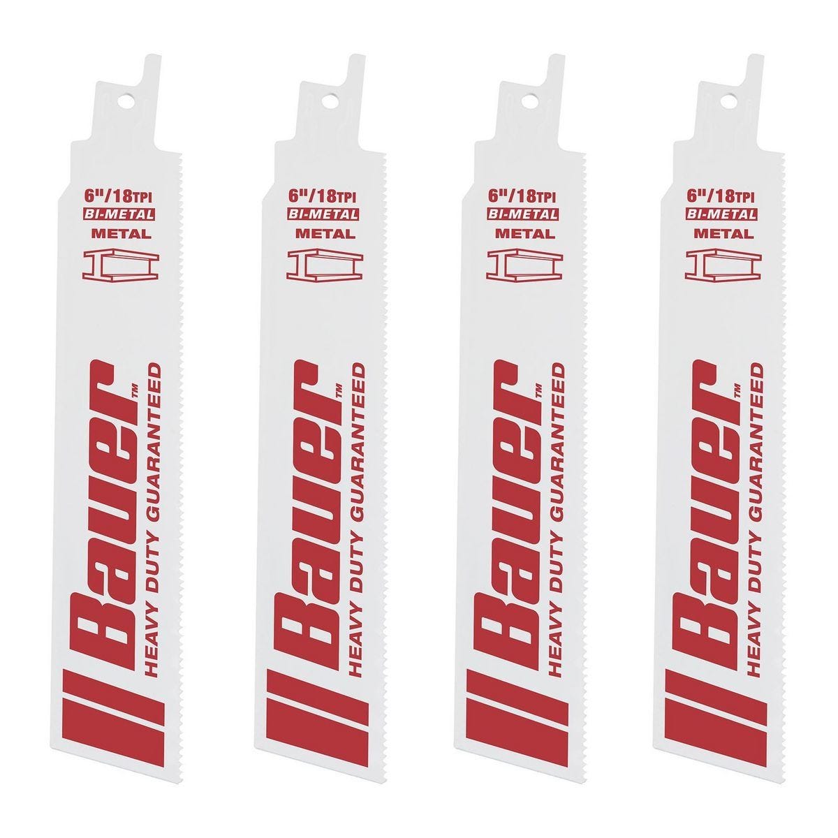 Juego de 4 hojas de sierra reciprocante bi-metal BAUER 18 TPI para corte de metal. Vida útil extendida y diseño que reduce vibraciones. Modelo 56848.