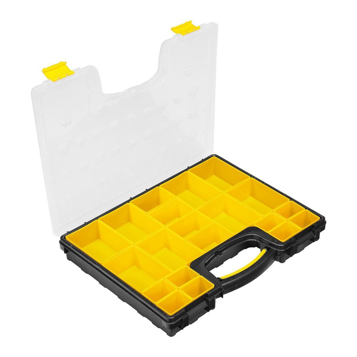 Organiza y transporta tus piezas pequeñas con el estuche de almacenamiento portátil STOREHOUSE. Este contenedor robusto, fabricado en polipropileno resistente, es ideal para talleres, sitios de construcción o cualquier entorno de trabajo exigente. Cuenta con 20 bandejas removibles de diferentes tamaños para clasificar tornillos, tuercas, componentes electrónicos y más. Su tapa transparente permite ver el contenido rápidamente y se asegura para evitar derrames. Incluye un asa integrada para un fácil transporte y su diseño permite apilarlo con los modelos de 8 y 15 compartimentos de la misma línea. Optimiza tu espacio de trabajo manteniendo todo en su lugar y accesible.