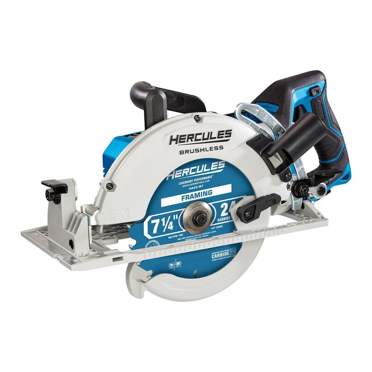 Sierra circular inalámbrica HERCULES 20V sin escobillas, 7-1/4 pulgadas, estilo worm-drive con empuñadura trasera – Solo herramienta | HCB72B-1