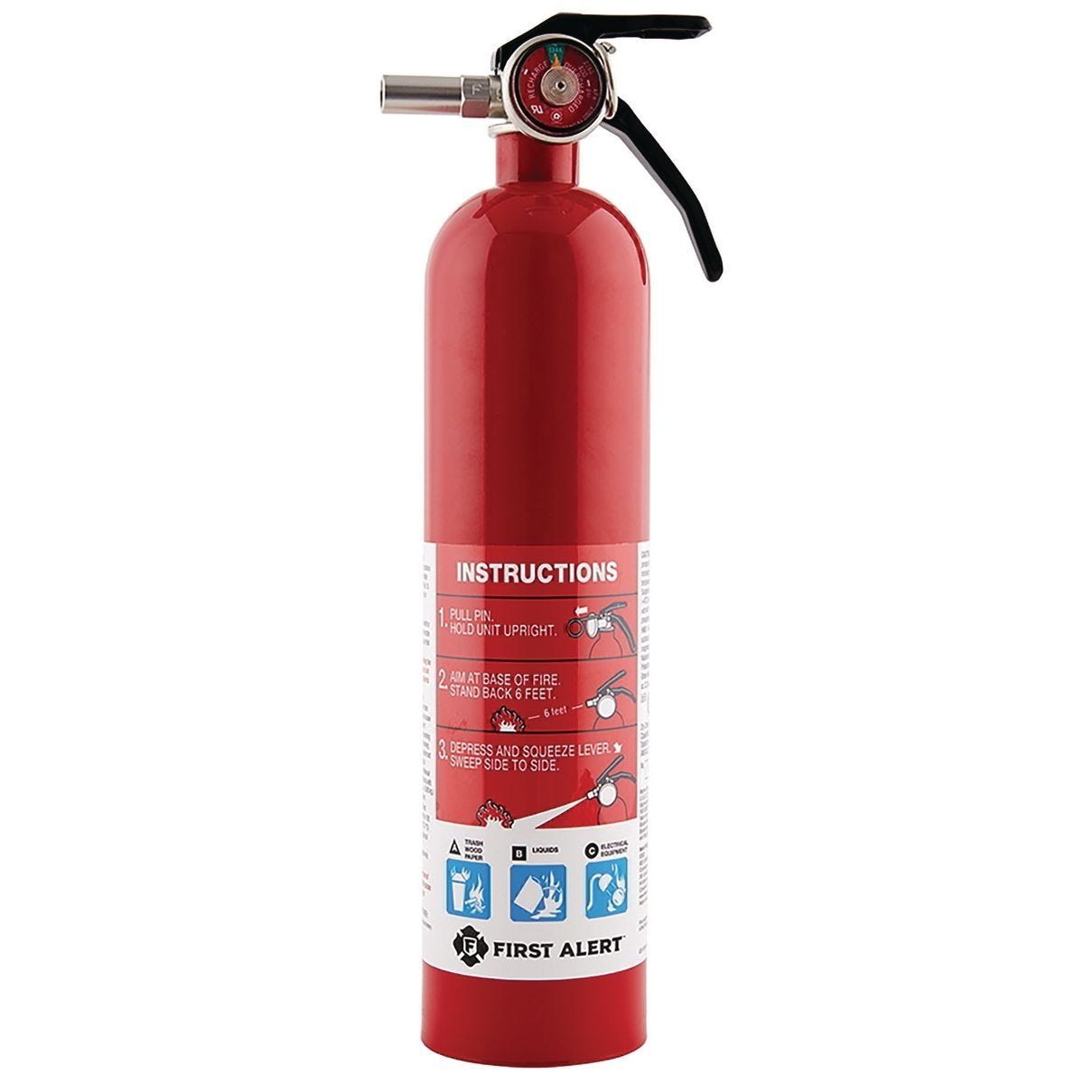 Extintor FIRST ALERT de 2.5 lb, clase 1-A 10-B C para fuegos en casa, taller y garaje. Incluye soporte de pared y cilindro de aluminio resistente. Modelo 70034.