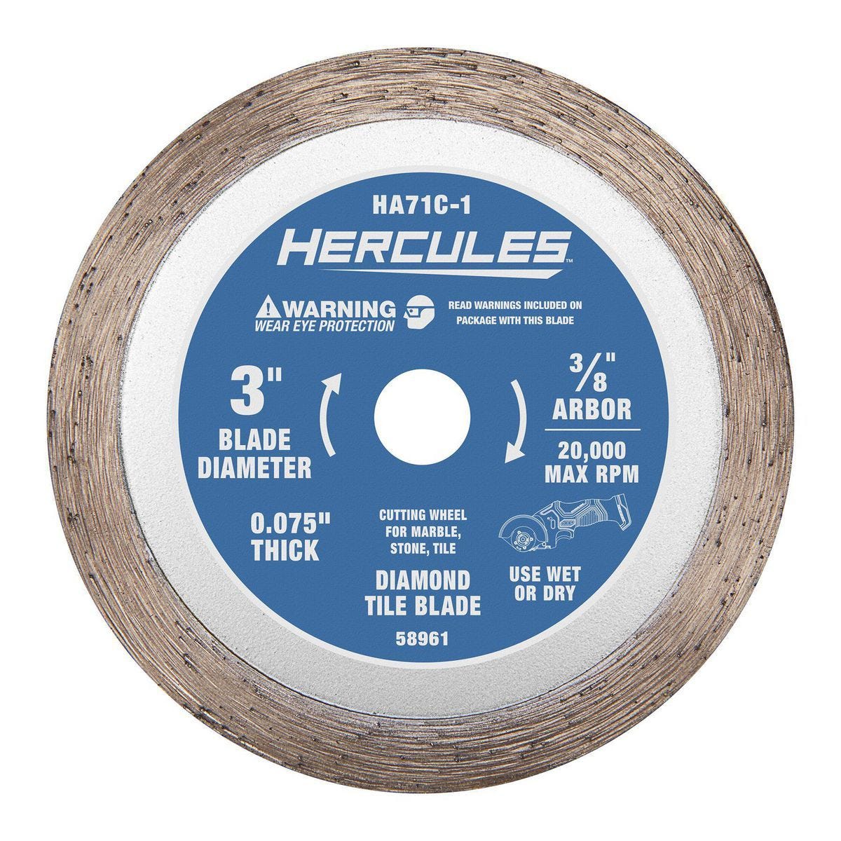 Disco diamantado HERCULES de 3 pulgadas para cortes precisos y sin astillas en mármol, piedra y azulejo. Ideal para uso húmedo o seco. Modelo HA71C-1.