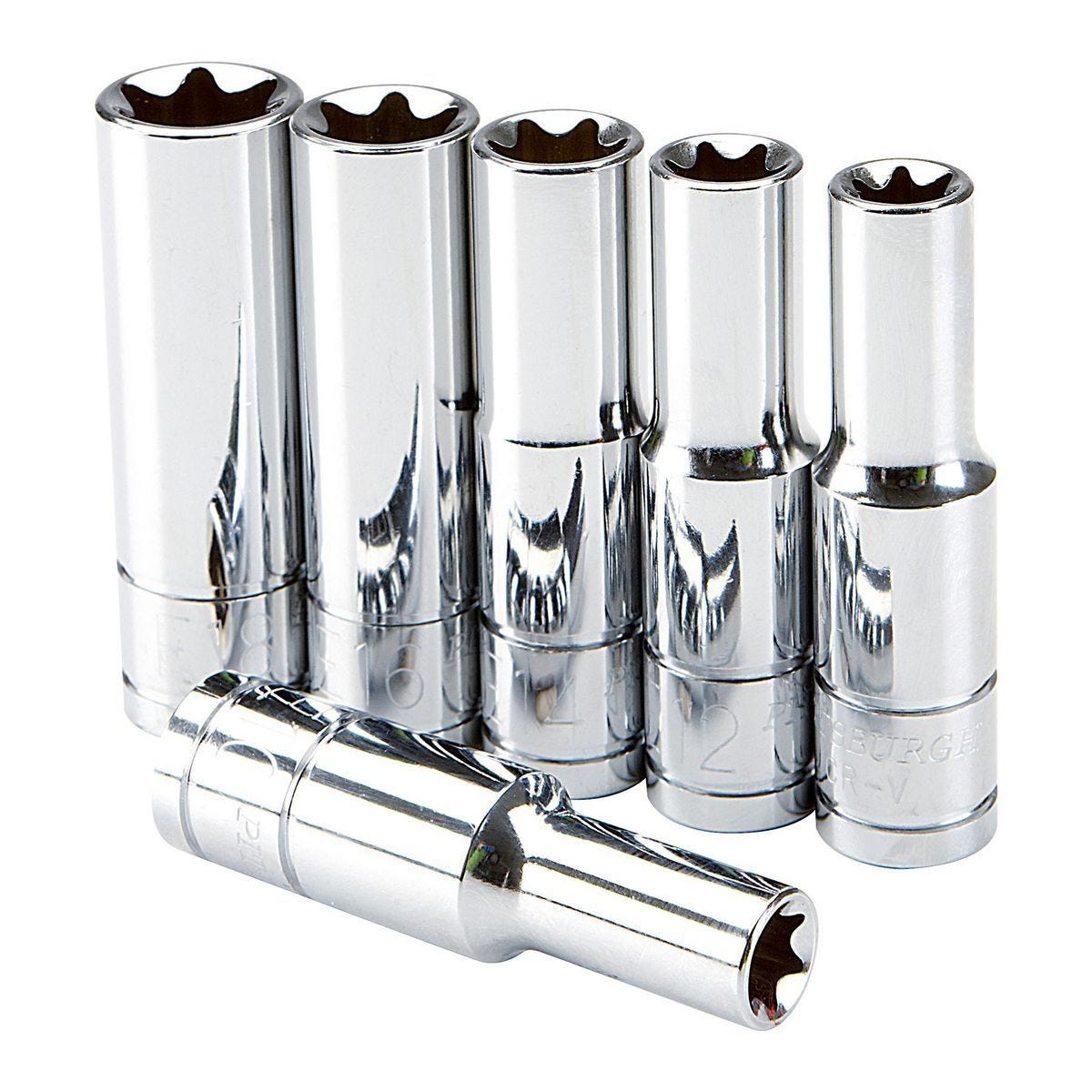 Juego de dados E-Socket Pittsburgh de 3/8 pulgadas para tornillos TORX. Acero cromo-vanadio, 6 piezas y marcas de alta visibilidad. Ideal para mecánica…
