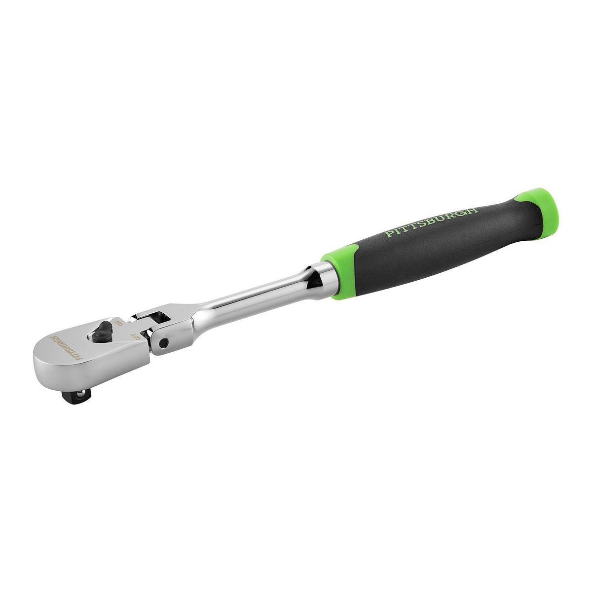 Llave de trinquete Pittsburgh de cabeza flexible 3/8 pulgadas, modelo 70150. Ideal para espacios reducidos, con mecanismo de 72 dientes y agarre cómodo.