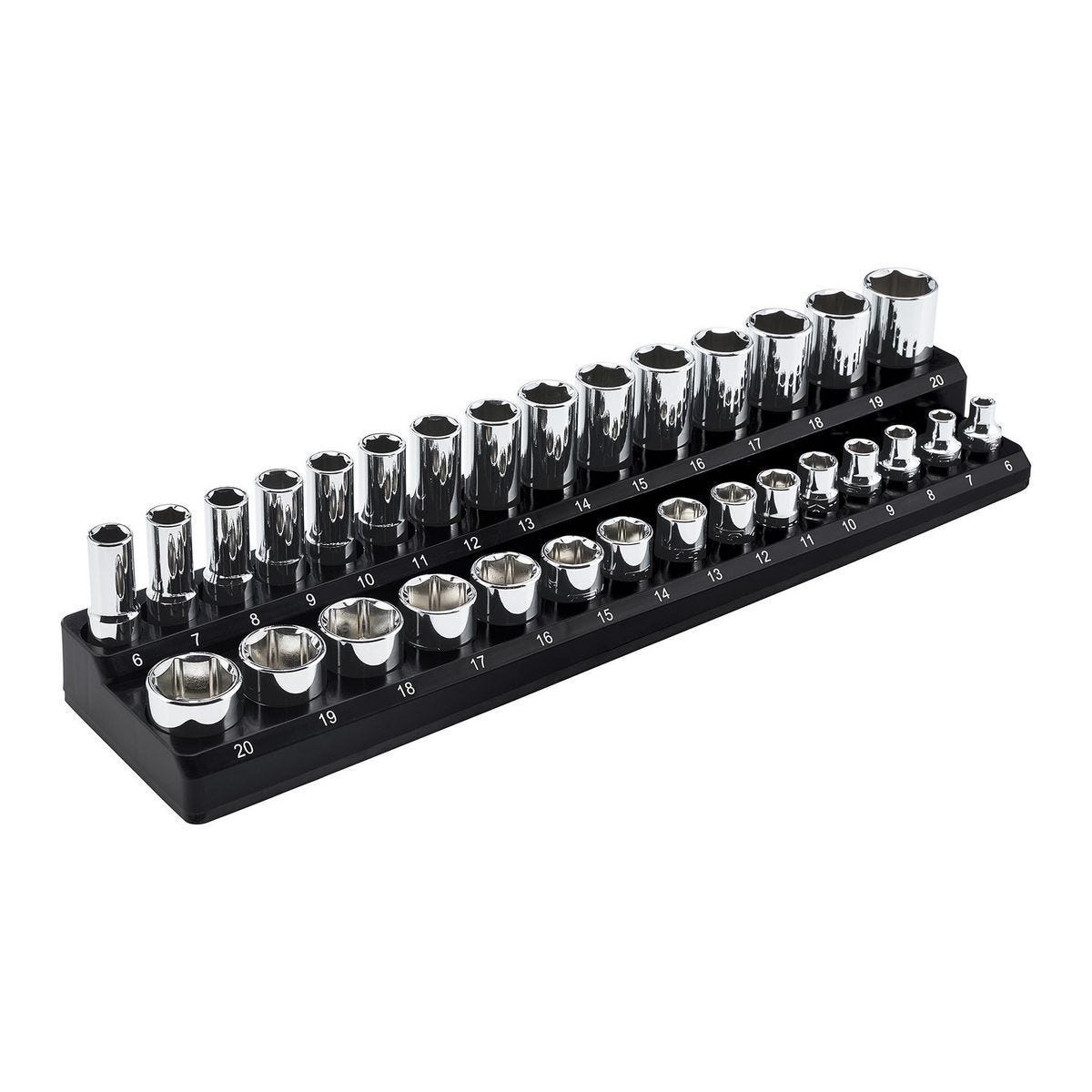 | Size(s) | 1 row for shallow sockets, 1 row for deep sockets in each of the following: 6 mm, 7 mm, 8 mm, 9 mm, 10 mm, 11 mm, 12 mm, 13 mm, 14 mm, 15 mm, 16 mm, 17 mm, 18 mm, 19 mm, 20 mm |