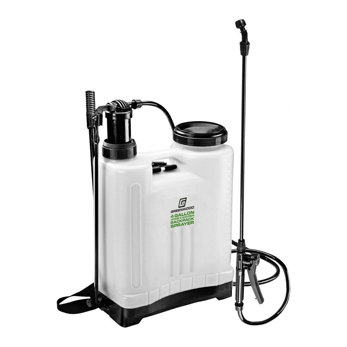Aspersor de mochila Greenwood de 4 galones para riego, fertilización y control de plagas. Tanque duradero y translúcido, incluye 4 boquillas. Modelo 63092.