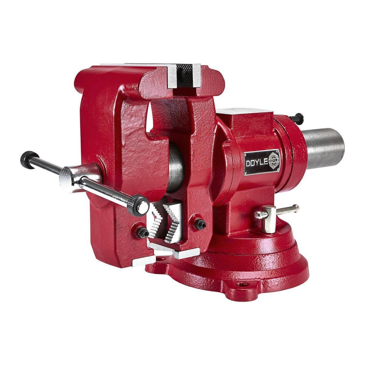 El tornillo de banco multiusos DOYLE es una herramienta robusta y versátil diseñada para trabajos de sujeción pesados en talleres y garajes. Cuenta con dos juegos de mordazas intercambiables: unas para material cuadrado y otras específicas para tubos, que sujetan firmemente piezas redondas desde 5/8 de pulgada hasta 4-3/16 de pulgadas de diámetro. Su base y cabeza giran 360 grados, permitiendo posicionamiento horizontal y vertical para mayor comodidad. Fabricado en hierro fundido dúctil de 60,000 PSI, ofrece una fuerza de sujeción de 8,000 libras y una profundidad de garganta de 3-5/8 pulgadas. Incluye un yunque integrado para trabajos de martilleo y enderezado ligero, y sus mordazas de acero endurecido de 5 pulgadas son reemplazables para una larga vida útil. Ideal para mecánicos, carpinteros y aficionados al bricolaje que necesitan una sujeción poderosa y adaptable.