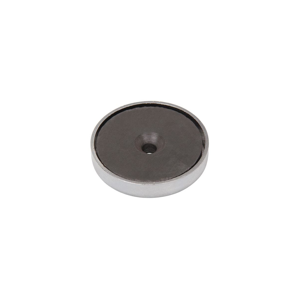 Imán redondo de 50 mm con fuerza de 25 lb. Ideal para taller, hogar y auto. Incluye gancho y tornillo para usos especiales. Modelo 96651.
