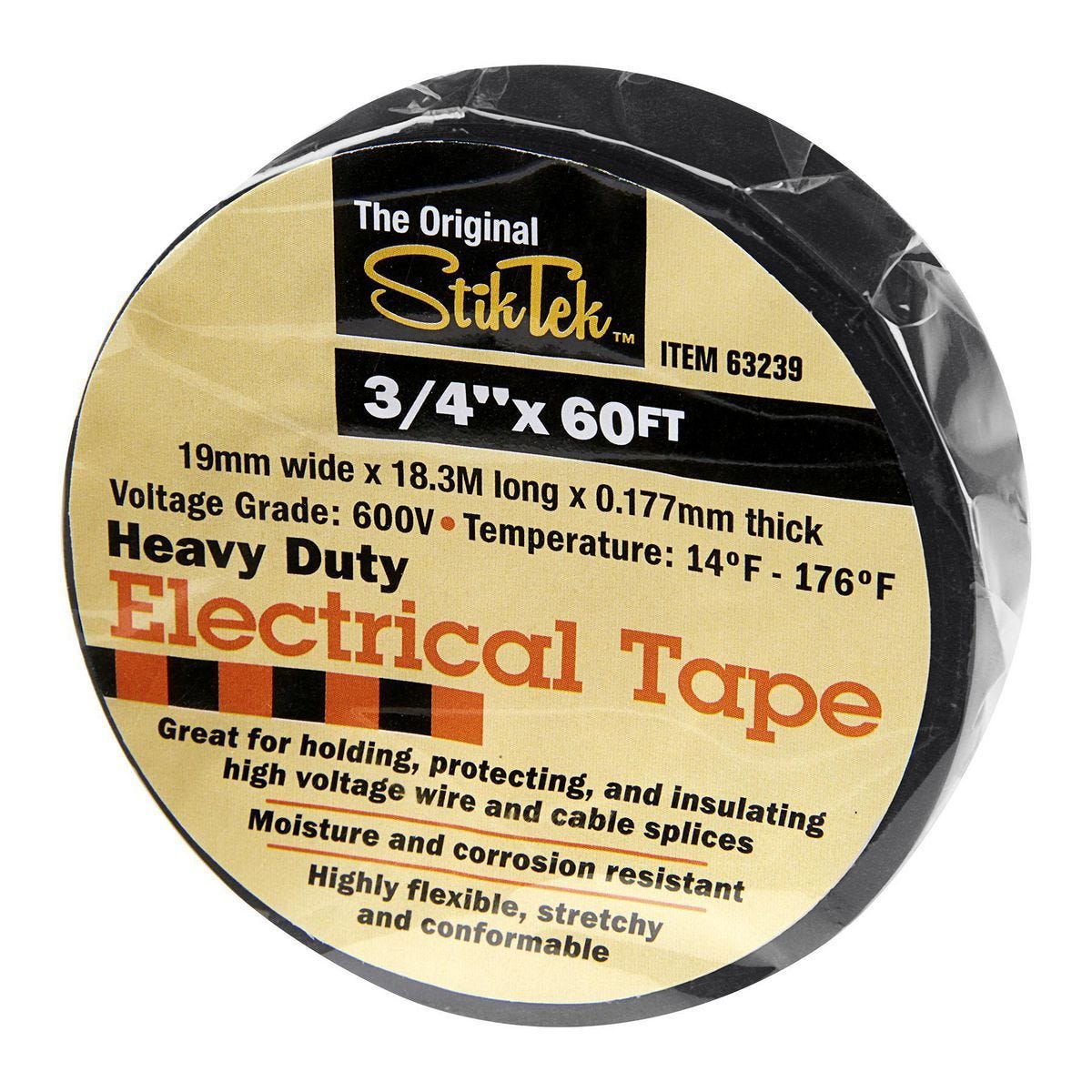 Cinta eléctrica industrial STIKTEK de 60 pies x 3/4 pulgadas. Resistente hasta 600V y 80°C, ideal para trabajos profesionales de cableado. Modelo 63239.