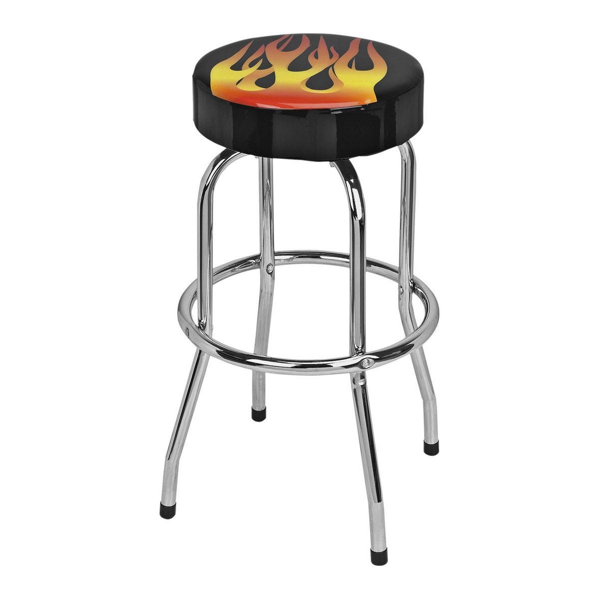 Taburete giratorio PITTSBURGH con diseño de llamas. Ideal para barras, soporta 300 lb, altura de 28-1/4 pulgadas. Estilo hot rod y construcción duradera.