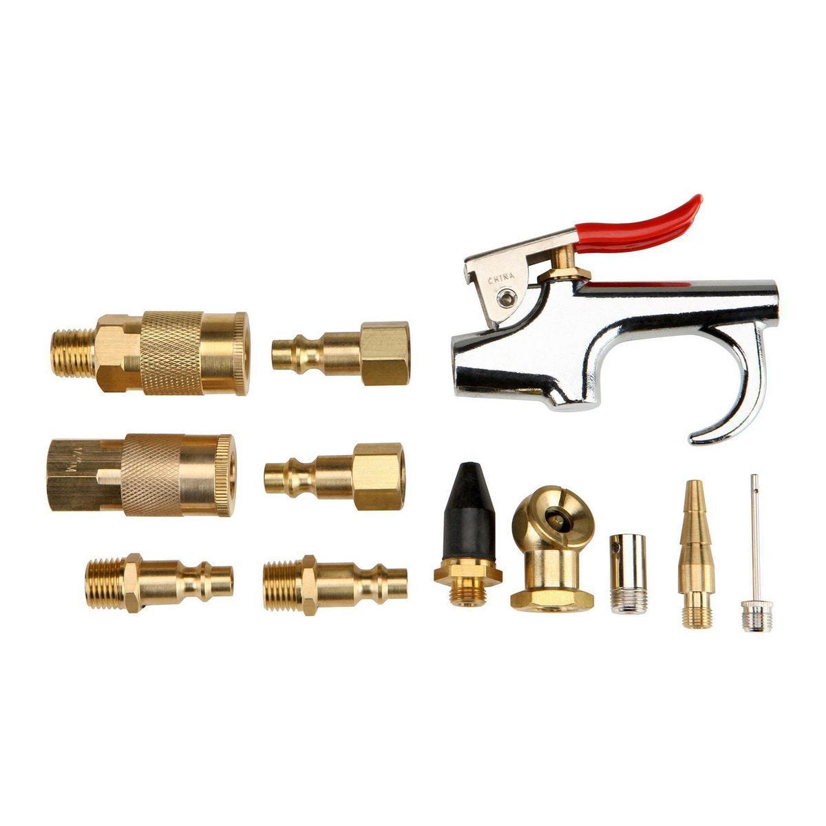 | Size(s) | (1) 1/4 in. brass industrial coupler – 1/4 in. -18NPTF, (1) 1/4 in. brass industrial coupler – 1/4 in. -18NPTM, (2) 1/4 in. brass industrial plugs 1/4 in. -18NPTF, (2) 1/4 in. brass industrial plugs 1/4 in. -18NPTM, (1) brass female ball foot tire chuck, (1) inflation needle, (1) blow gun, (1) safety nozzle, (1) rubber tip, (1) tapered inflation nozzle |