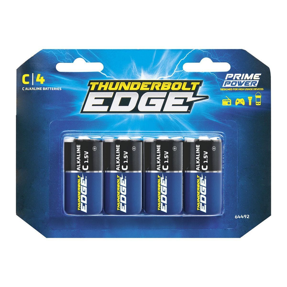 Paquete de 4 baterías alcalinas C THUNDERBOLT EDGE PRIME POWER. Vida extra larga para controles remotos, juguetes, linternas y herramientas. Modelo 64492.