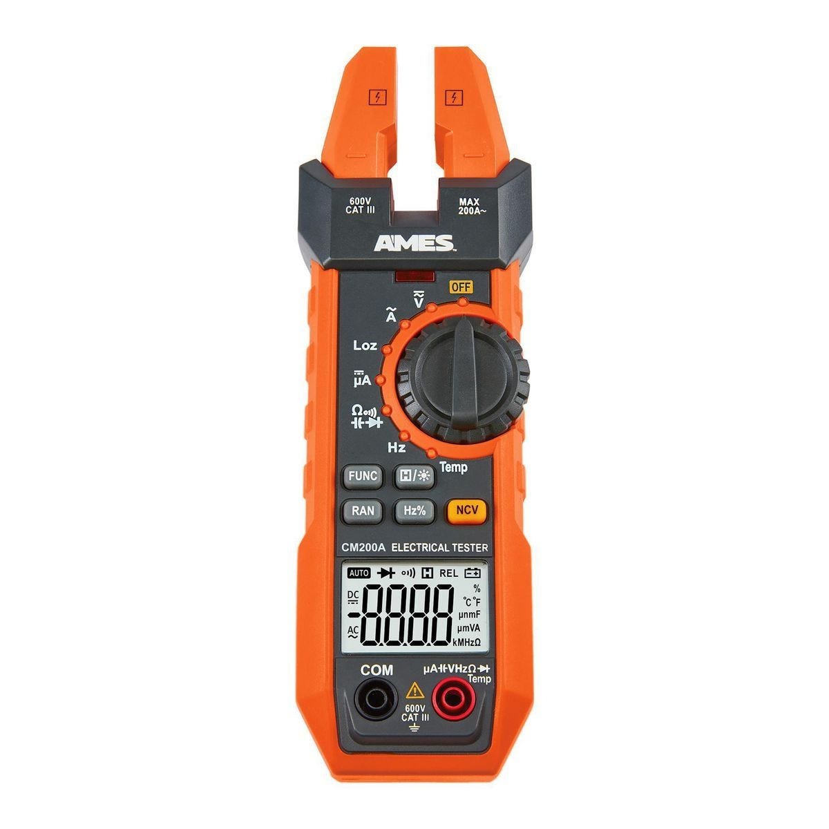 Multímetro de pinza AMES INSTRUMENTS CM200A para medir corriente hasta 200A sin cortar el circuito. Incluye detección de voltaje sin contacto, luz de trabajo y…