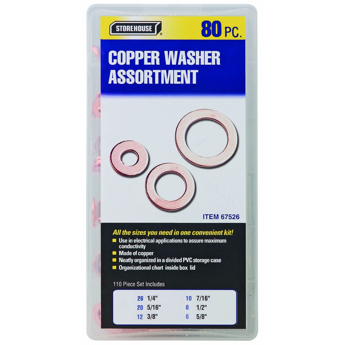 Juego de 80 arandelas de cobre STOREHOUSE para máxima conductividad eléctrica. Incluye 6 tamaños SAE en estuche organizador. Modelo 67526.