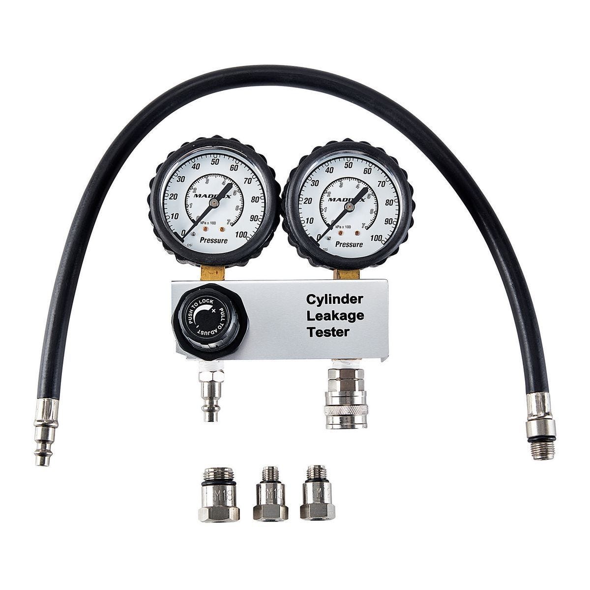 Kit probador de fugas en cilindros MADDOX® para diagnóstico preciso de motores. Incluye manómetro dual, adaptadores y estuche. Modelo MH5-1, SKU 64918.