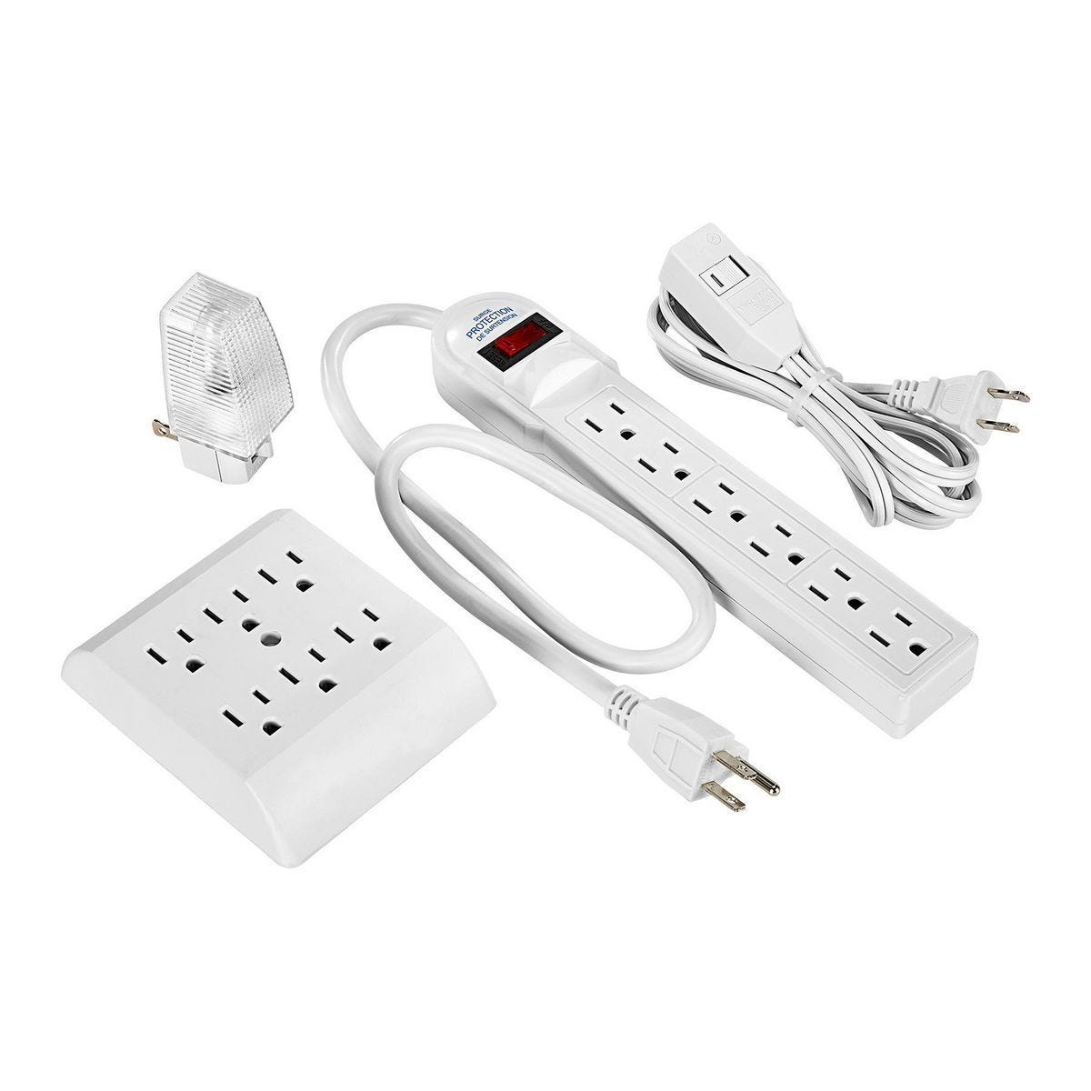 | Contents | 7 watt night light, 6-outlet power strip with rocker switch, 6-outlet wall tap, and 6 ft. extension cord with 3 outlets |