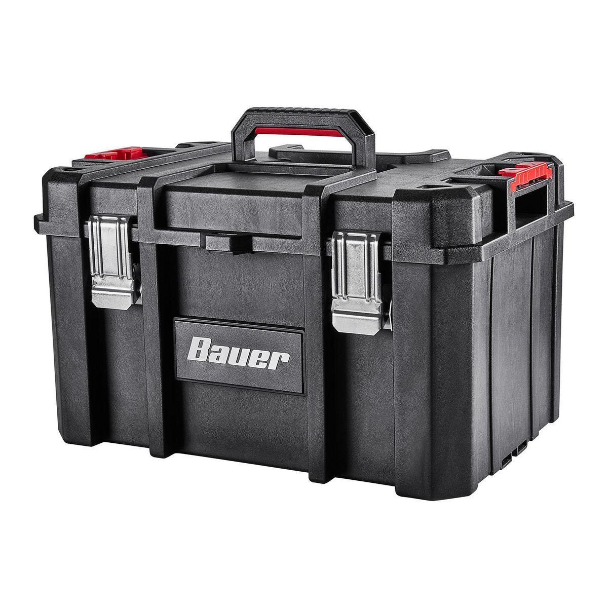 La caja de herramientas modular grande BAUER es la solución robusta y personalizable para organizar tu taller o espacio de trabajo. Fabricada en resina de alto impacto, esta caja forma parte del sistema de almacenamiento modular BAUER, permitiendo más de 50 combinaciones de configuración. Incluye tarjetas de herramientas removibles para organizar alicates, destornilladores y más, con una capacidad de carga de 50 lb. Sus seguros metálicos fuertes mantienen las herramientas a salvo durante el transporte, y su clasificación IP65 garantiza resistencia al polvo y salpicaduras de agua. Con asas laterales para un agarre cómodo, es la opción ideal para profesionales y aficionados que buscan durabilidad, organización eficiente y un sistema que crece con sus necesidades. Modelo 201322M-B.