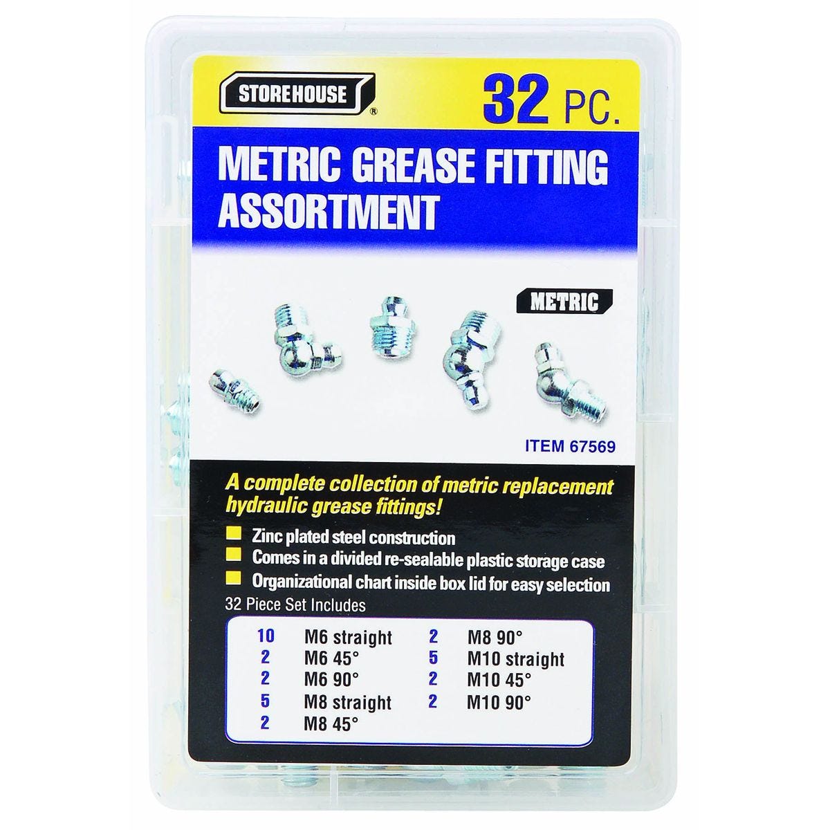 Juego de 32 válvulas de engrase métricas STOREHOUSE en acero zincado. Incluye caja organizadora y gráfico de identificación para mantenimiento de maquinaria.