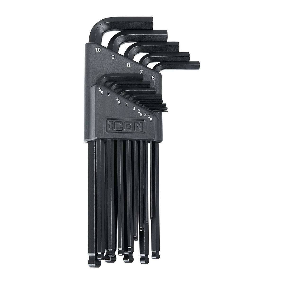 Juego de llaves hexagonales ICON con punta esférica, 13 piezas métricas en acero S2. Ideal para acceder a tornillos difíciles. Incluye organizador.