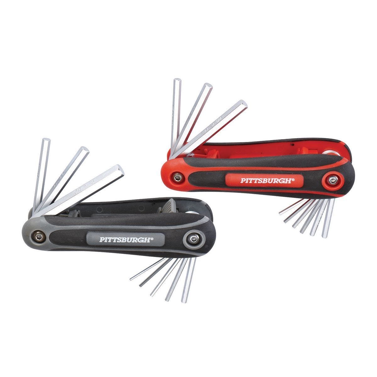 Juego de llaves Allen plegables Pittsburgh, 2 piezas en medidas SAE y métricas. Acero cromo-vanadio, mangos con agarre de goma y diseño compacto. Modelo 94650.
