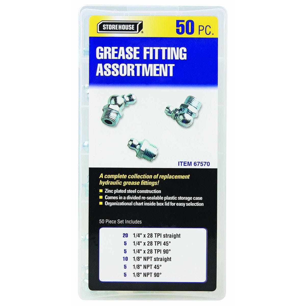 | Size(s) | 1/4 in. x 28 TPI fittings: 20 straight, five 45°, five 90°; 1/8 in. – 28 NPT fittings: 10 straight, five 45°, five 90° |