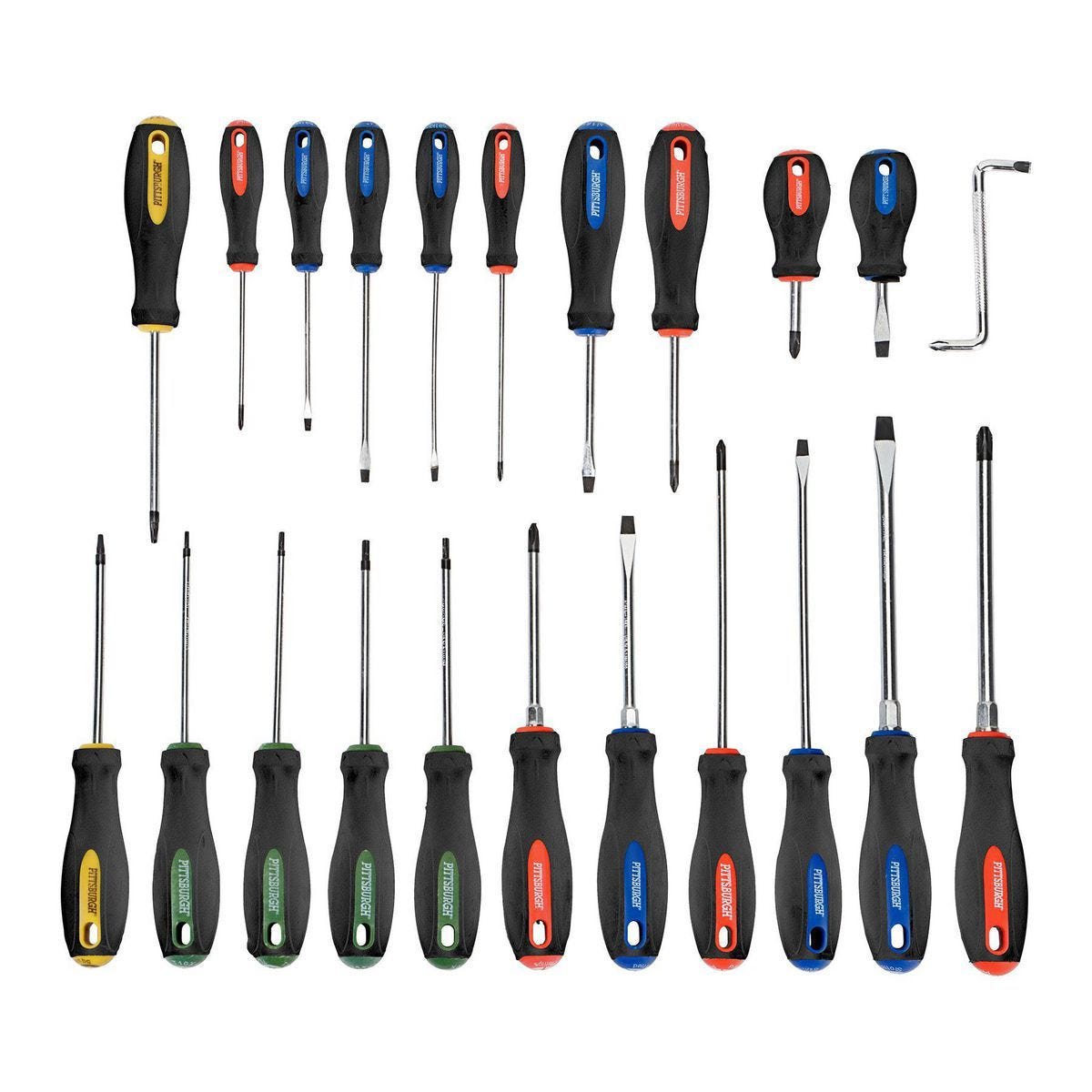 Juego profesional de 22 desarmadores Pittsburgh con puntas Phillips, planas, estrella y cuadrada. Mangos antideslizantes y acero al cromo-vanadio duradero.…