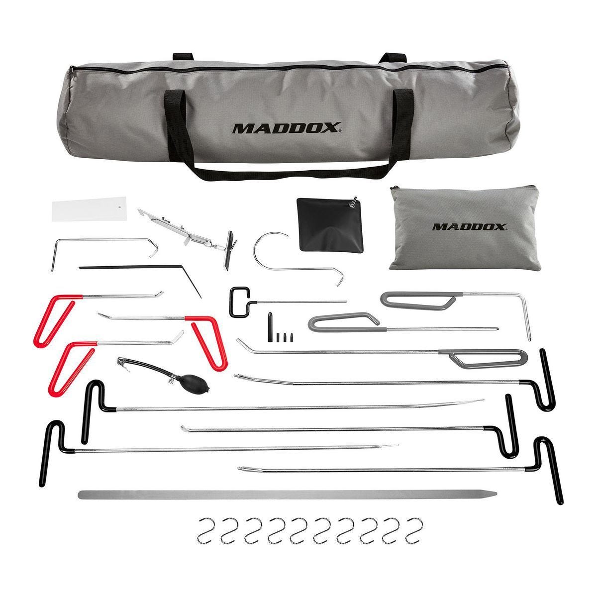 Kit MADDOX de 33 piezas para reparación de abolladuras sin pintura (PDR) en paneles de puertas y guardafangos. Incluye cuña de aire, varillas y ganchos. Modelo…