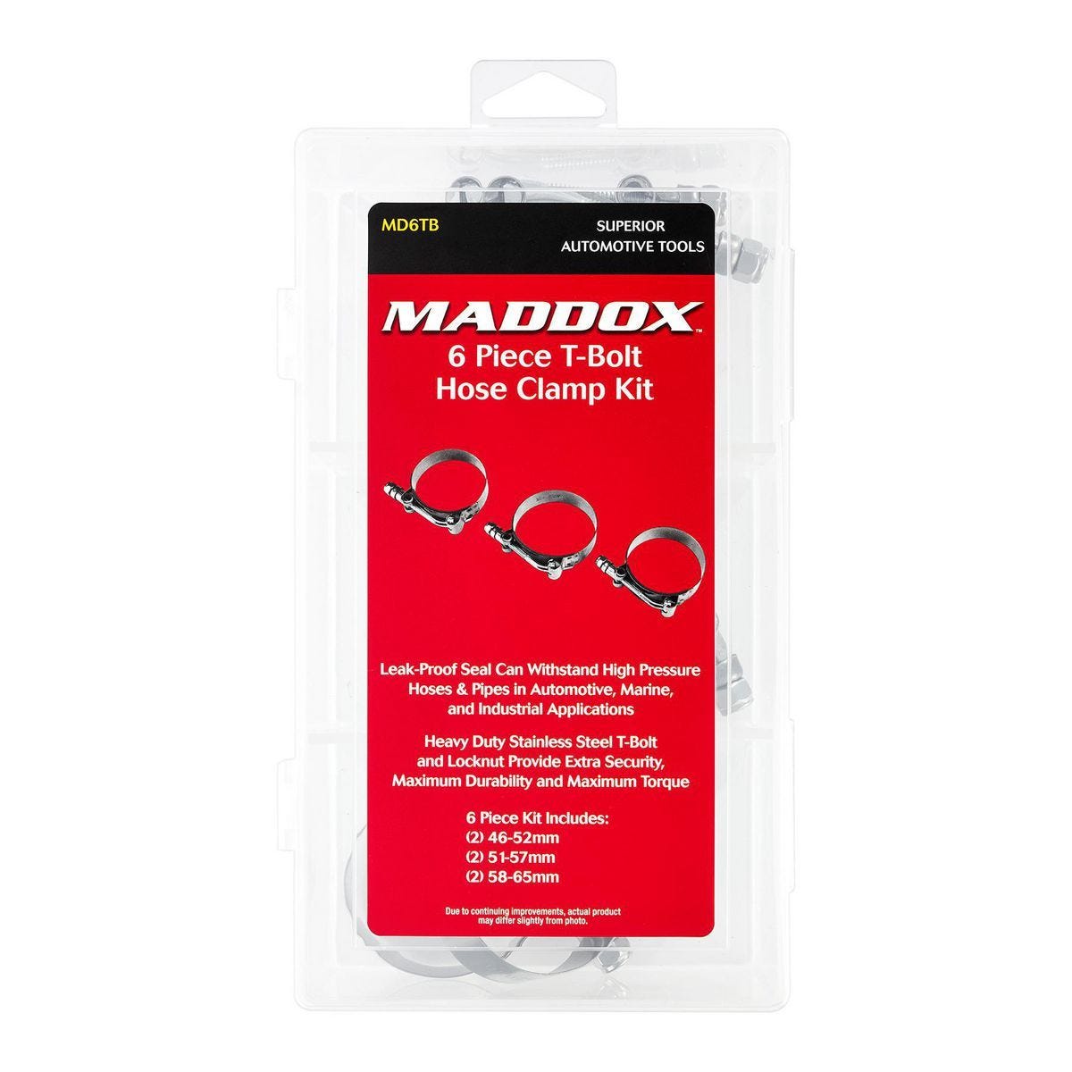 Kit profesional de 6 abrazaderas tipo T MADDOX MD6TB en acero inoxidable. Sella mangueras de alta presión en aplicaciones automotrices, marinas e industriales.